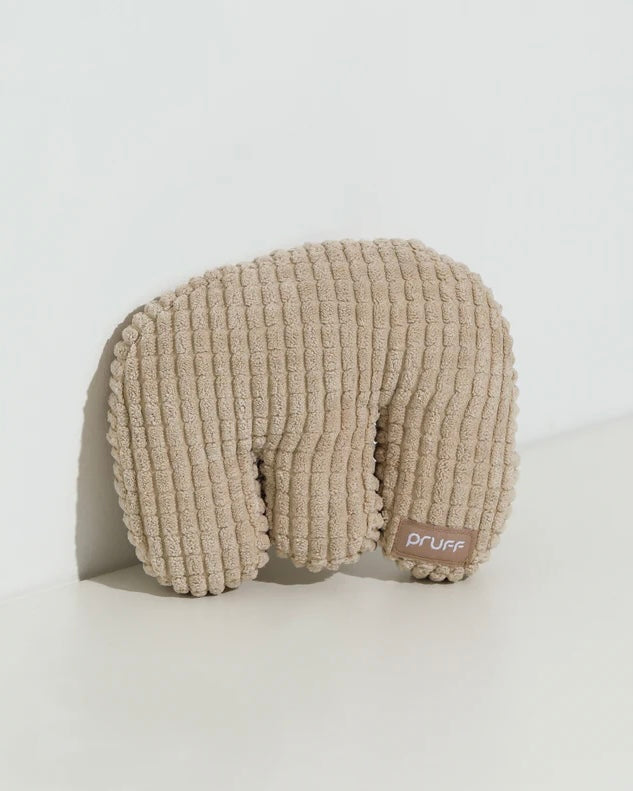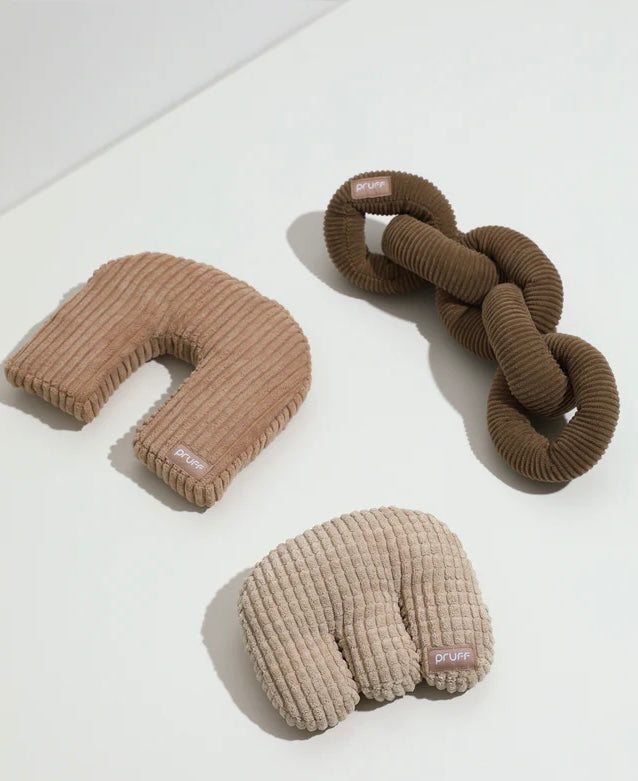 Our Modern Minimalist Dog Toy: The Em plush toy is a unique shape with a squeaker inside. Great for soft play and chewing. This neutral colored dog toy is made from a tufted velveteen pile fabric.