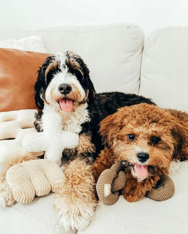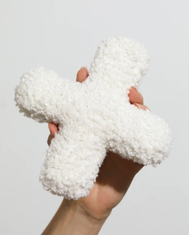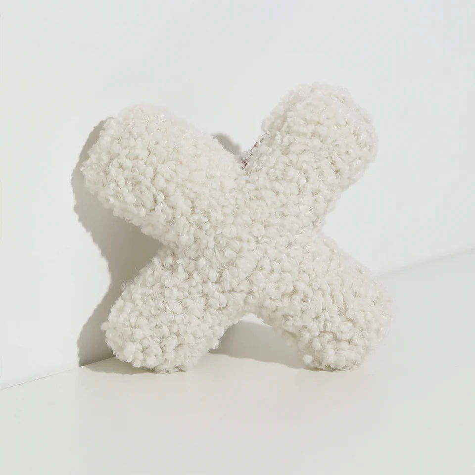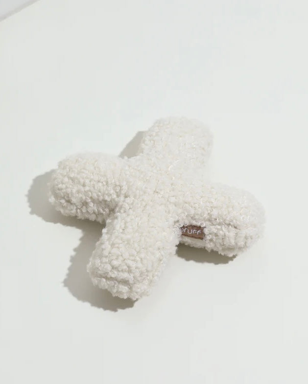 Our Modern Minimalist Dog Toy: The Hugs plush toy is made from classic Pruff boucle fabric. With a squeaker inside and easy throwing X shape. This neutral colored dog toy is great for tossing and retrieving.