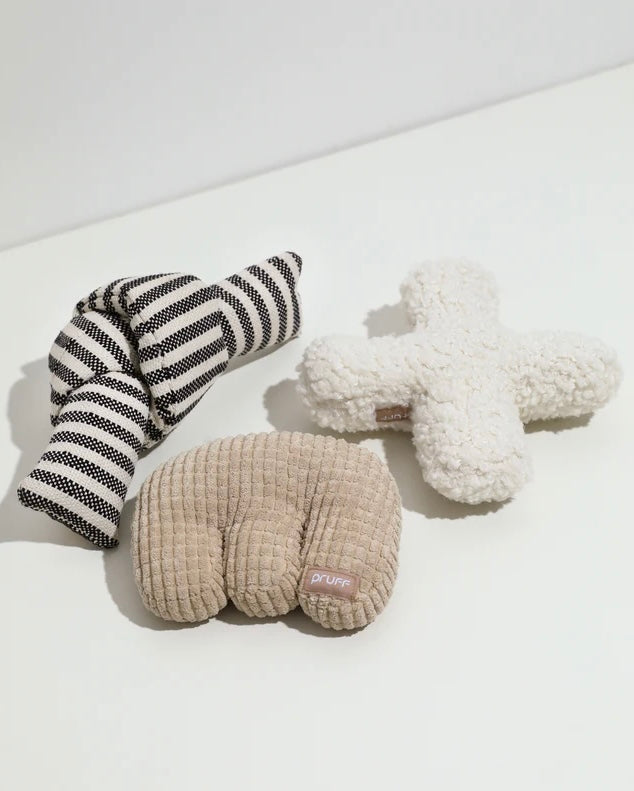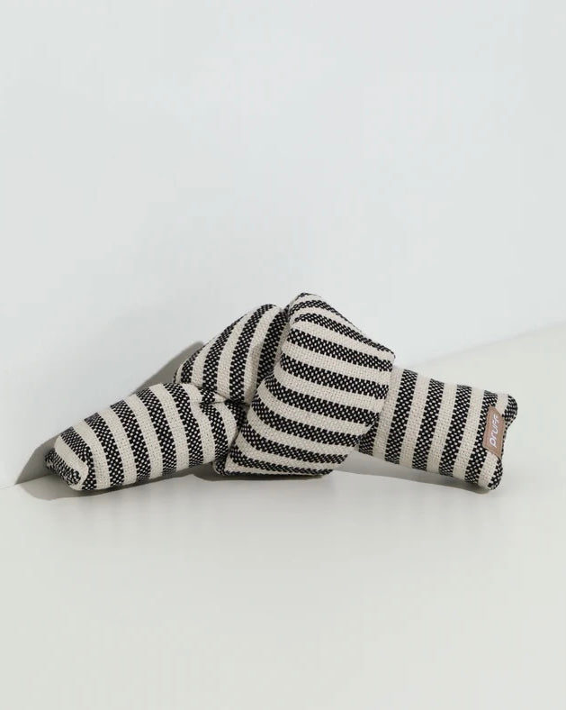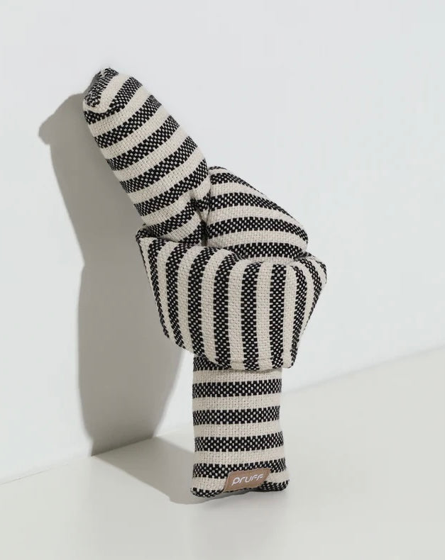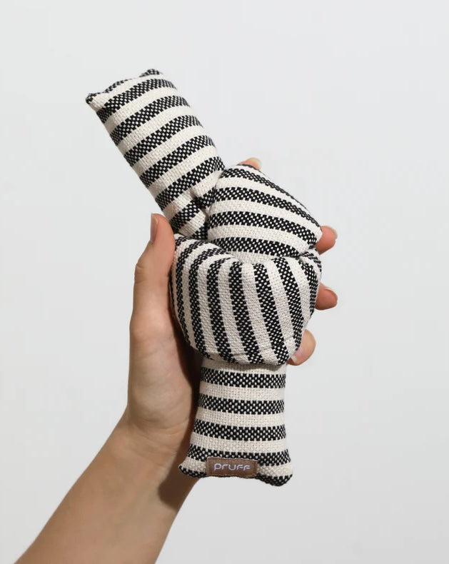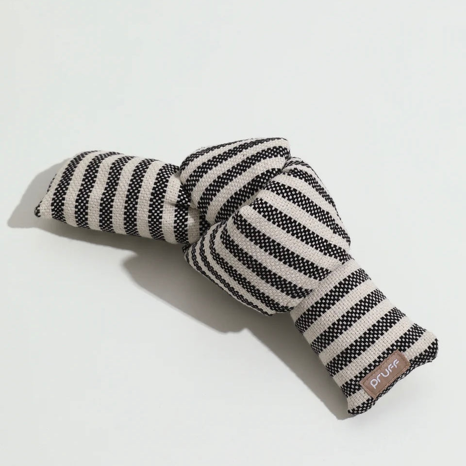 Our Modern Minimalist Dog Toy: The Knot plush toy is made of woven striped fabric and can be tied and untied. Crinkle interior and the challenge to unknot makes this neutral colored dog toy great for hours of fun.