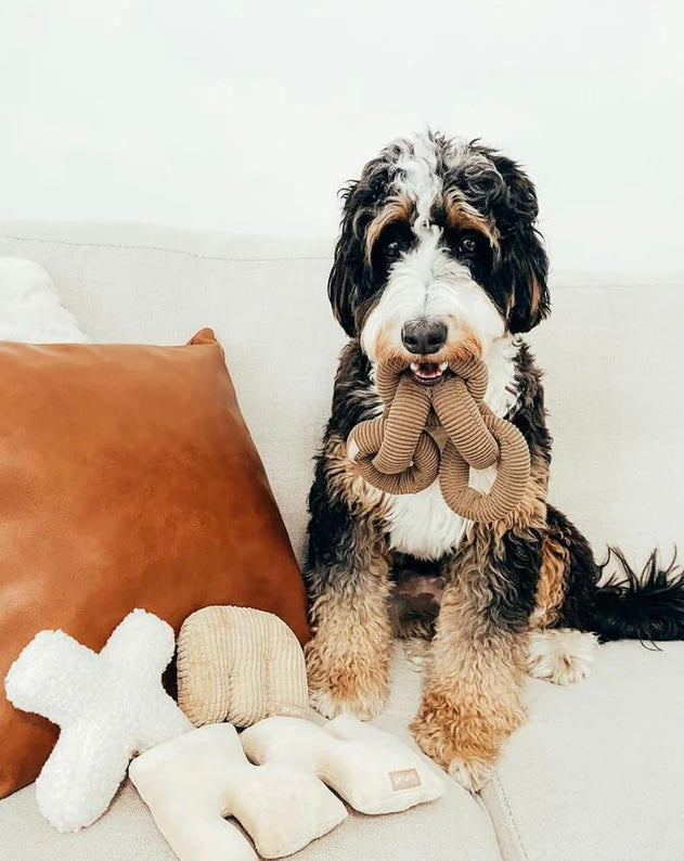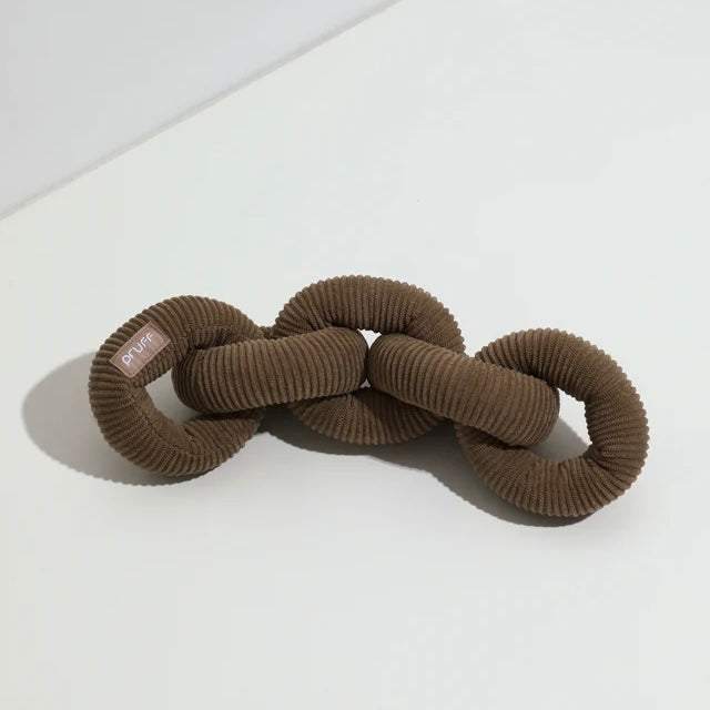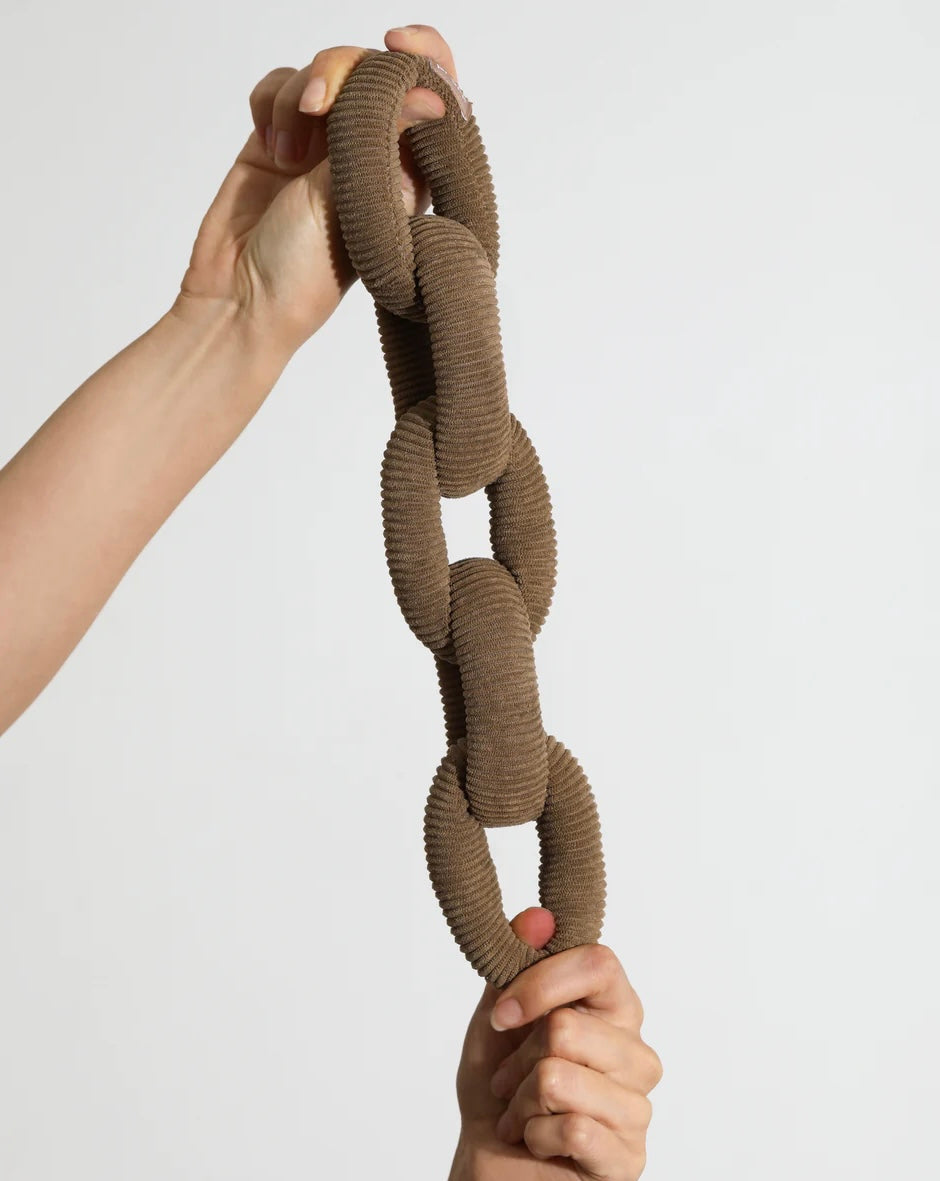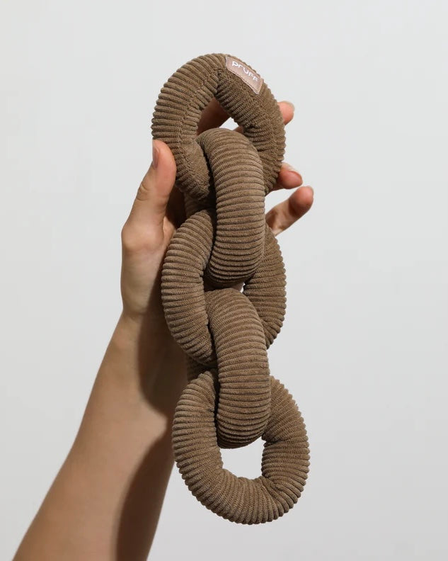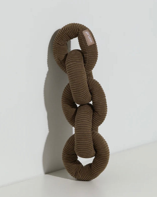 Our Modern Minimalist Dog Toy: soft corduroy link toy is great for quiet play. Fun for dogs of all sizes. This neutral colored dog toy is soft to the touch, lightweight and stretchy! It measures 28 cm long and 7,62 cm wide.