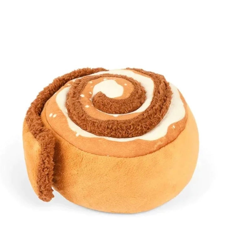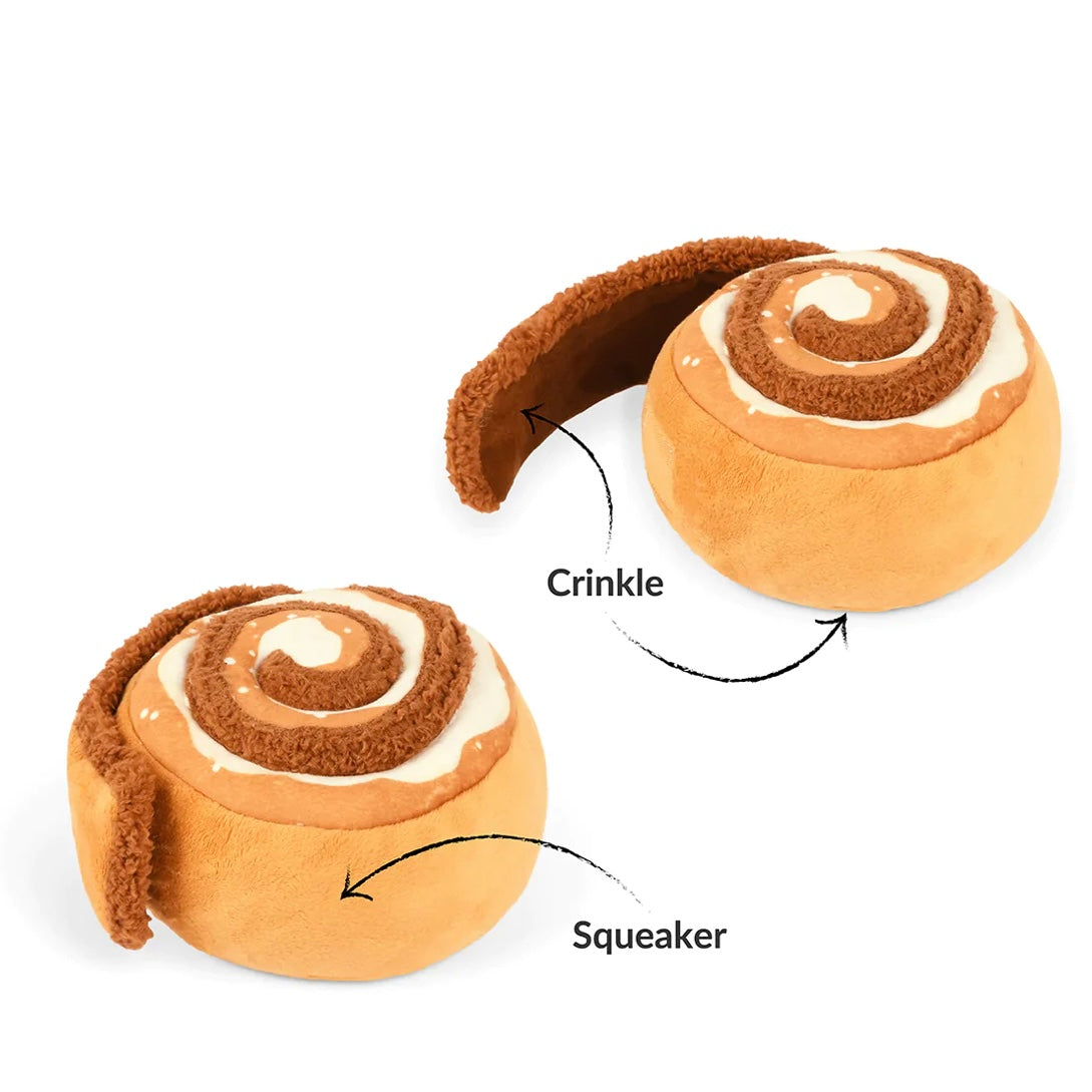Der Hundespielzeug, Cinna-Bone von PLAY knistert und hat eine Quietscher . Die Zimtschnecke kann sogar sein etwas entrollt .