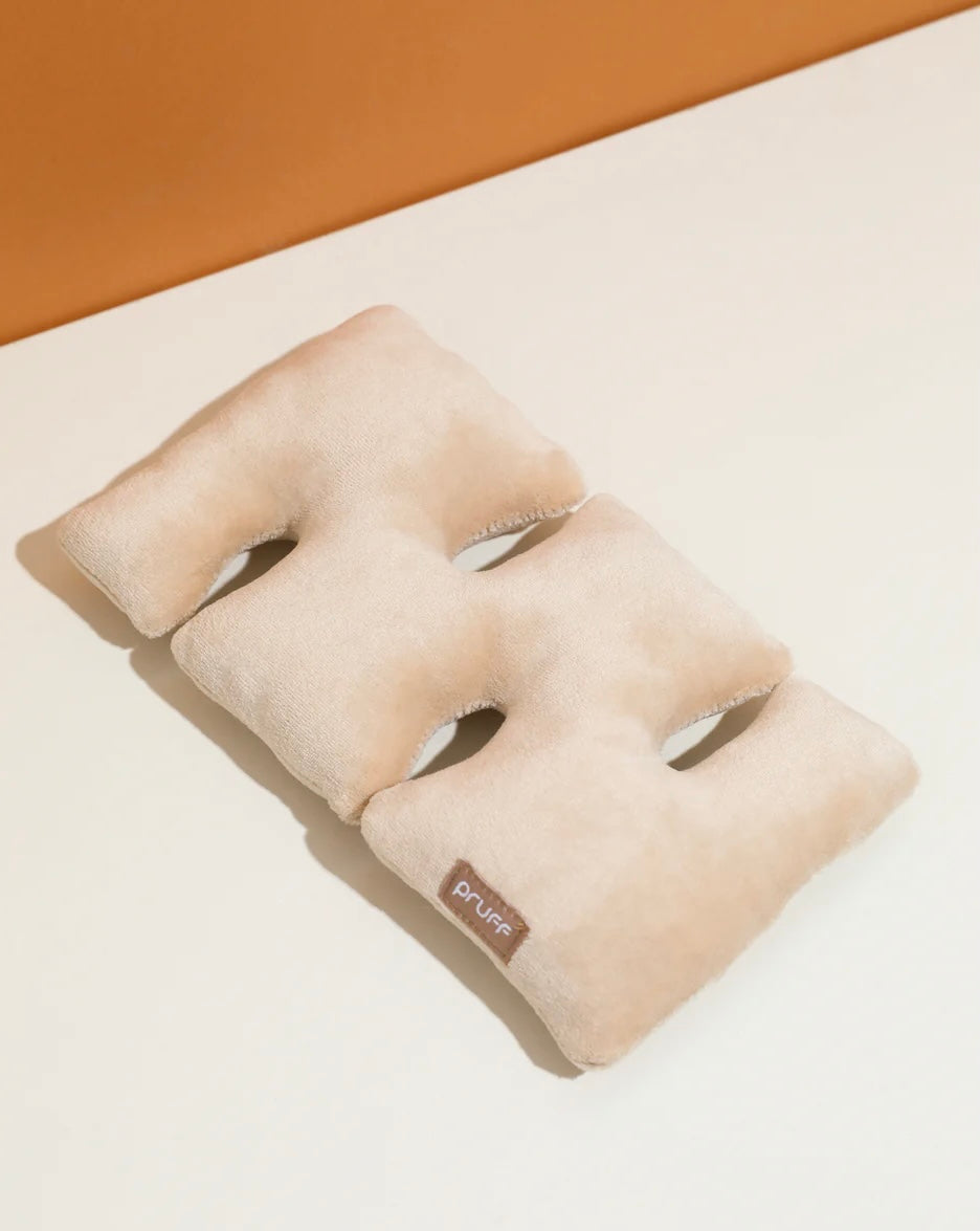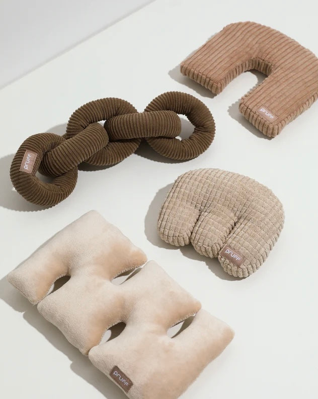Our Modern Minimalist Dog Toy: The velvet puzzle shaped play object has both a squeaker up top and crinkle on bottom. This neutral colored dog toy is designed for maximal sensory fun.