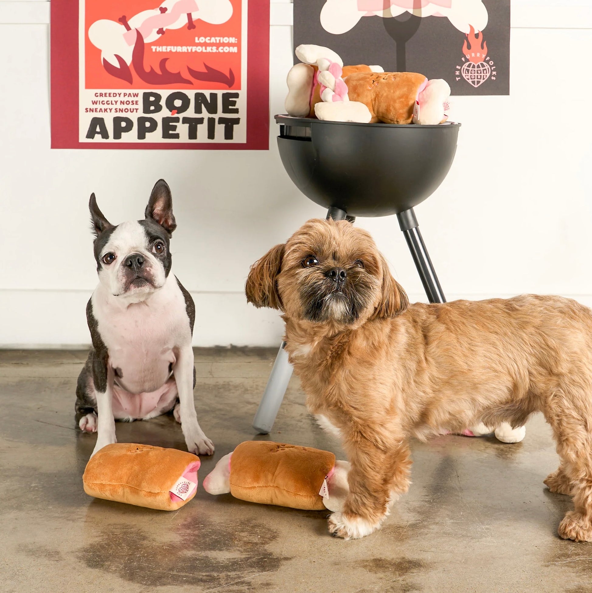 Insert the treat-filled bone back into the plush “meat” and let your dog pull, tug, and work to uncover the hidden rewards