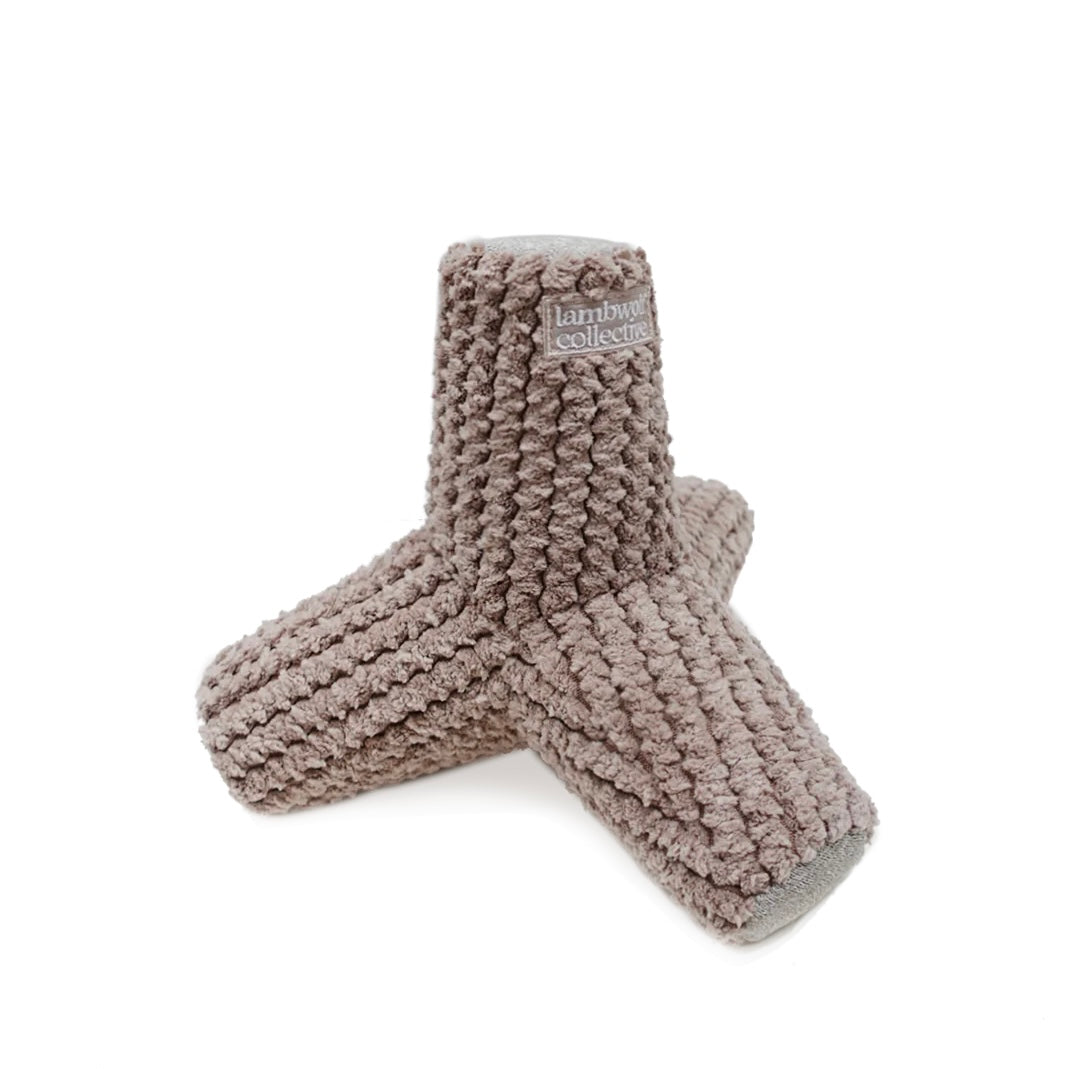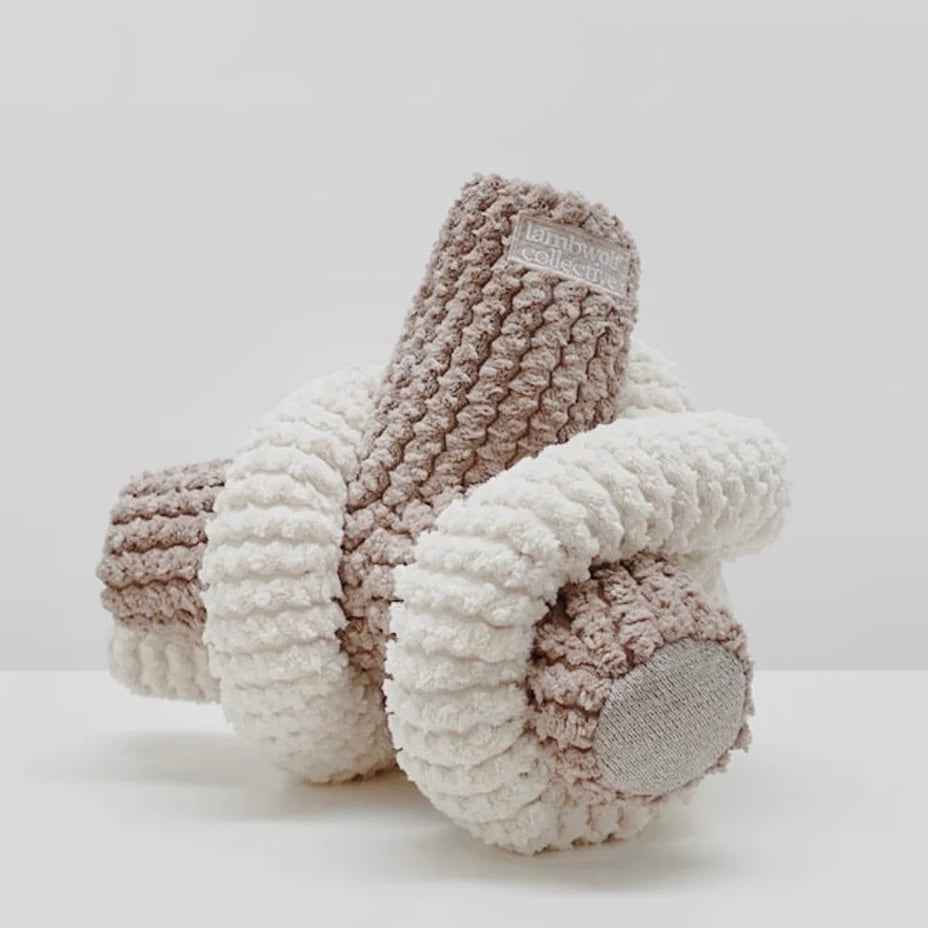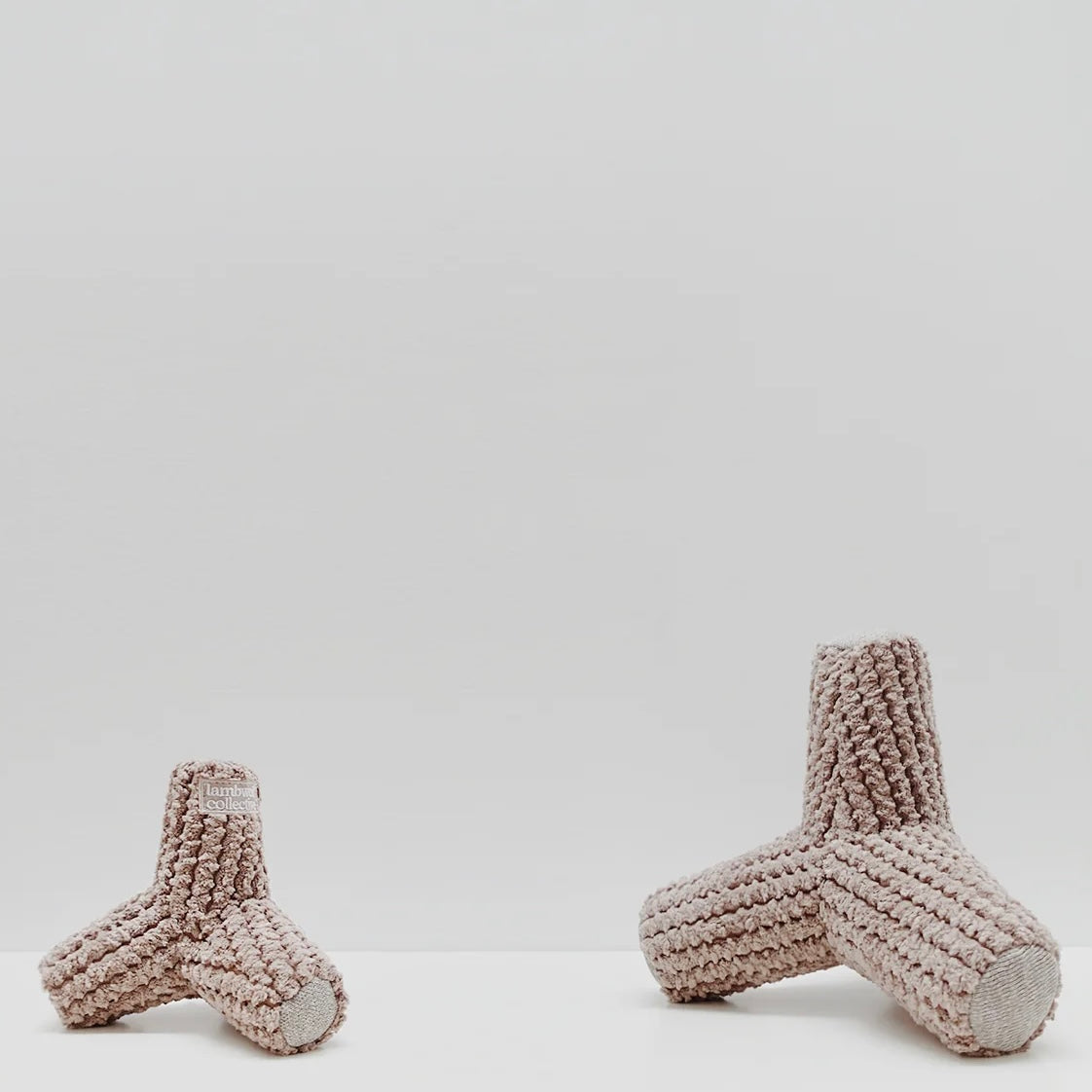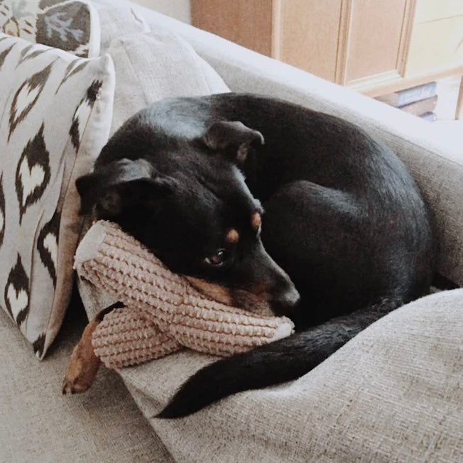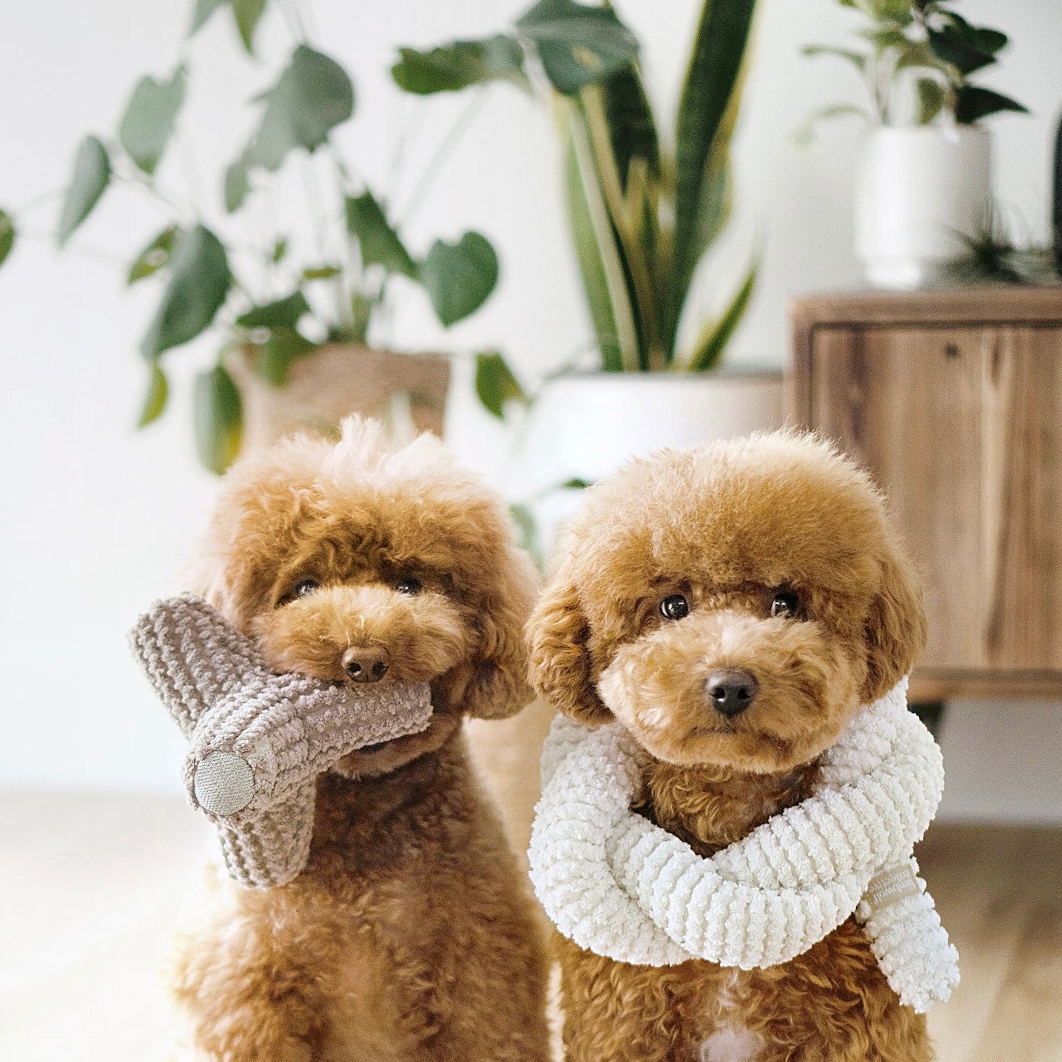 The taupe BREUER has 2 squeakers + 2 crinkle paper clusters in the corners, the cream BREUER has 4 squeakers. Each corner is sized to massage the jaws easily. When rested, Breuer turns into a soft sculpture and decorates a contemporary home. The soft and textured cotton on top of the corduroy fabric is gentle on your pet's mouth and gum.