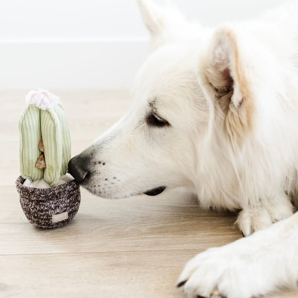 This snuffle CACTUS allow you to hide treats in between the 4 slots, features multiple textures to stimulate the canine mouth and the bottle knitted pot is filled with squeakers!