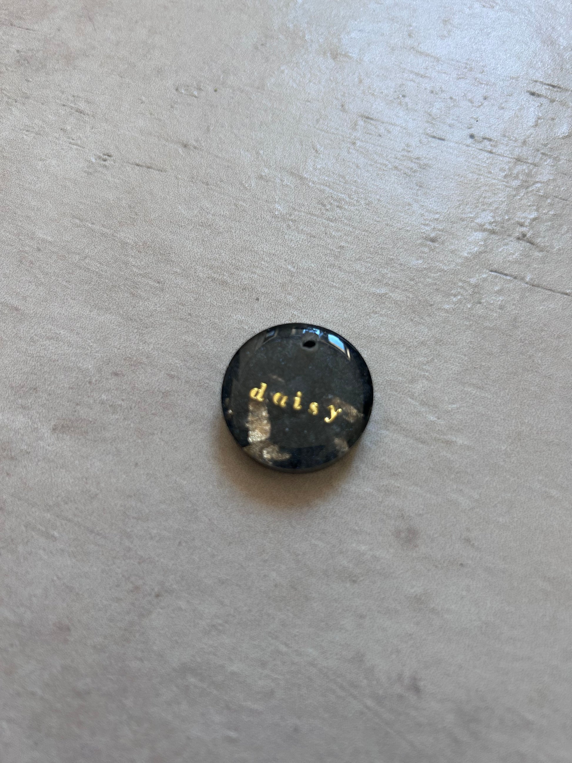 Dog tags are made of epoxy resin and are sturdy and non-toxic.