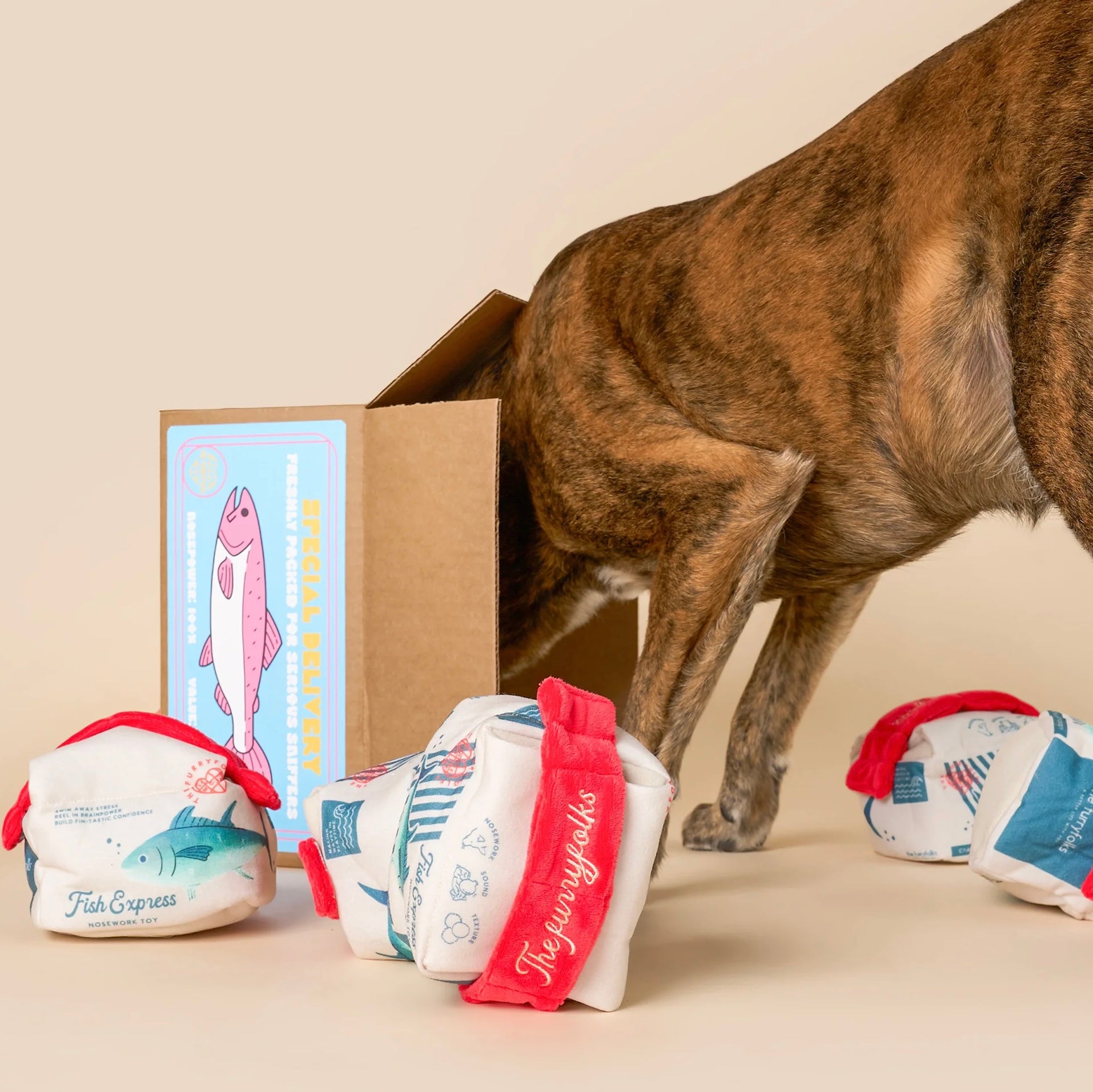This unique snuffle toy for dogs features a soft delivery box with multiple hidden compartments. Inside, your dog will discover a treat-stashing fish, crinkly textures, and a squeaky surprise, making every play session exciting, engaging, and rewarding. Simply hide treats in different layers – the tape, inside the box, and inside the fish – and let your pup sniff and “unbox” their reward.
