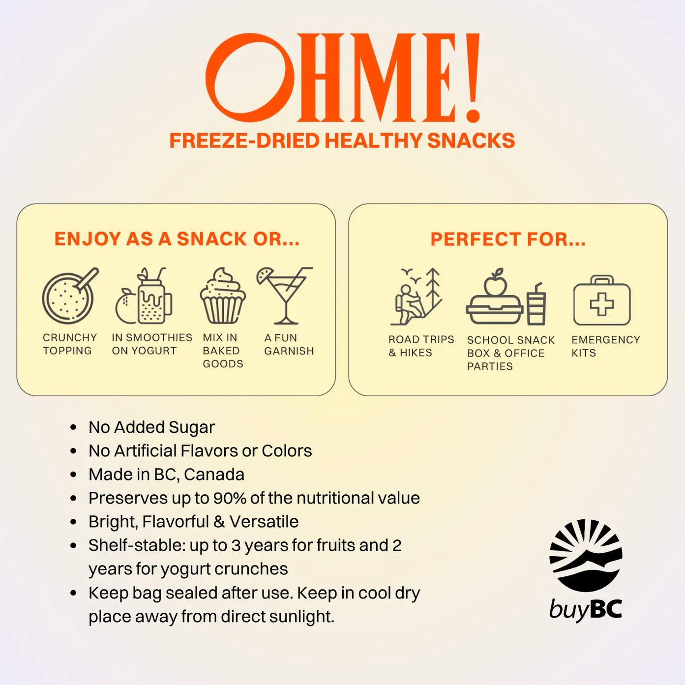 Enjoy freeze-dried fruit snacks made with love in British Columbia, designed to be enjoyed by both humans and dogs. Made from 100% real fruit only, with no added sugar and no preservatives, these snacks are as pure as it gets.