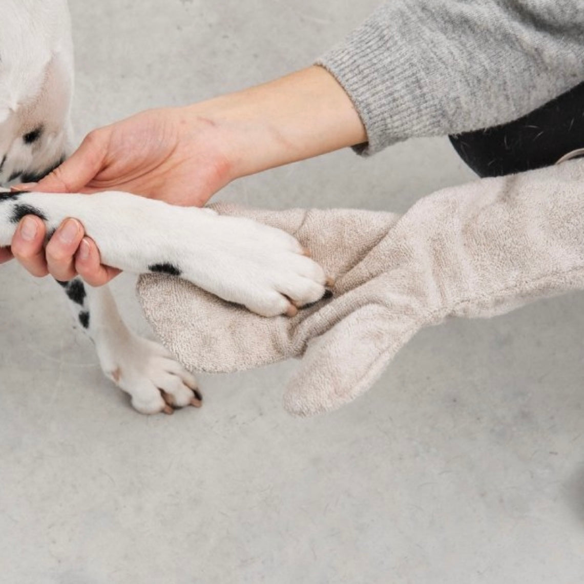 The soft Guanto dog drying glove is made of highly-absorbent organic cotton terry cloth for precise drying and cleaning of paws.