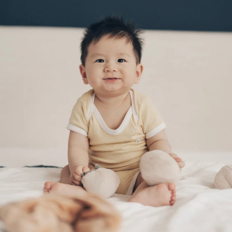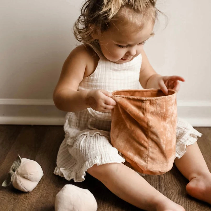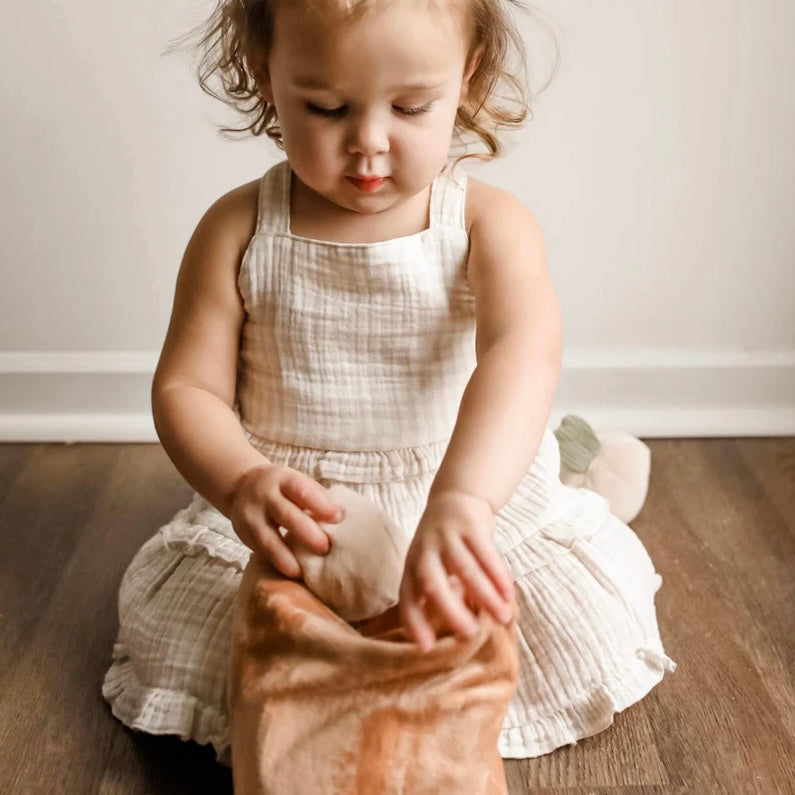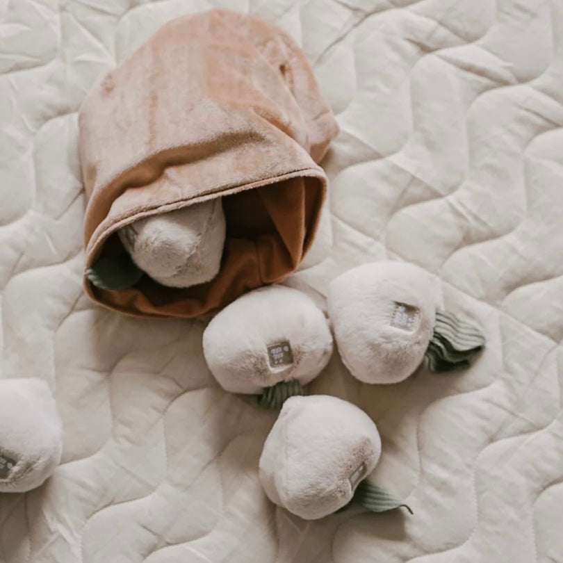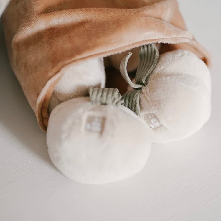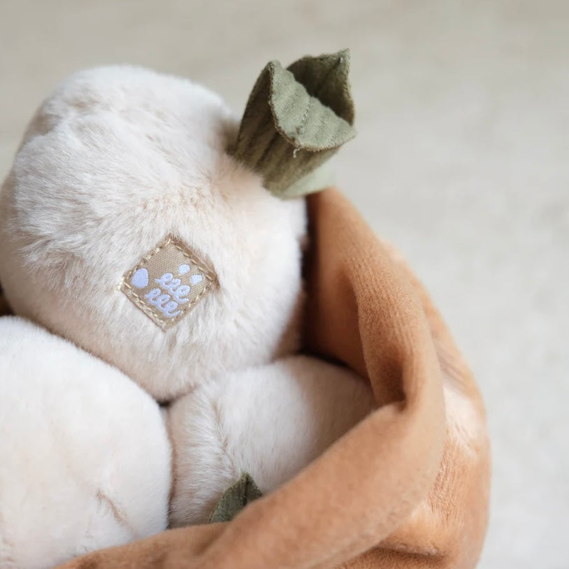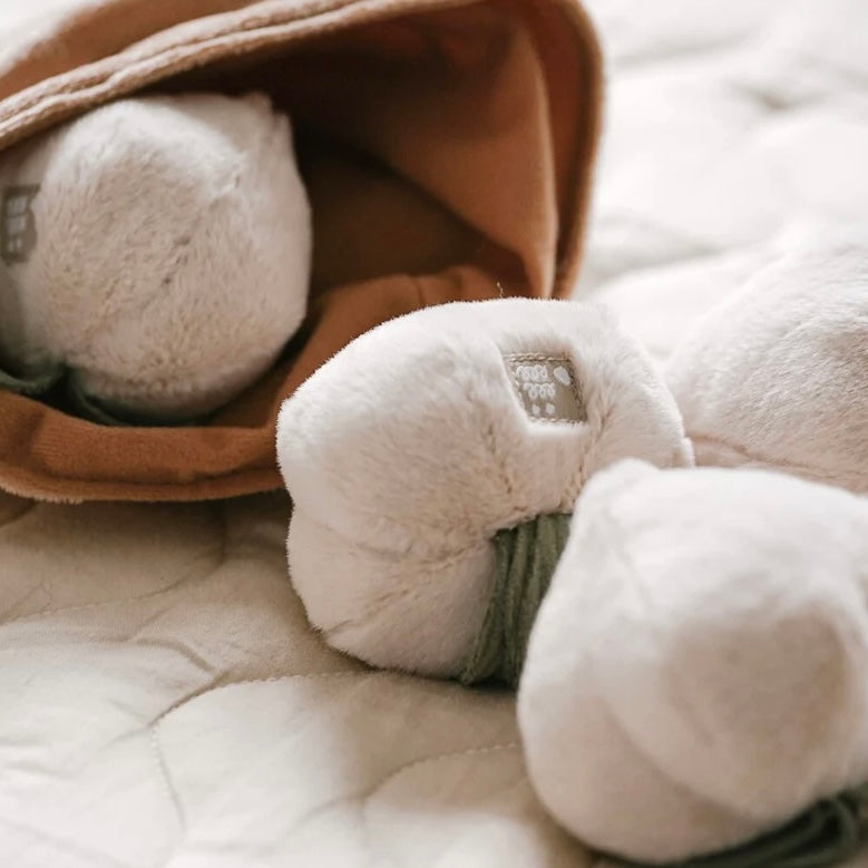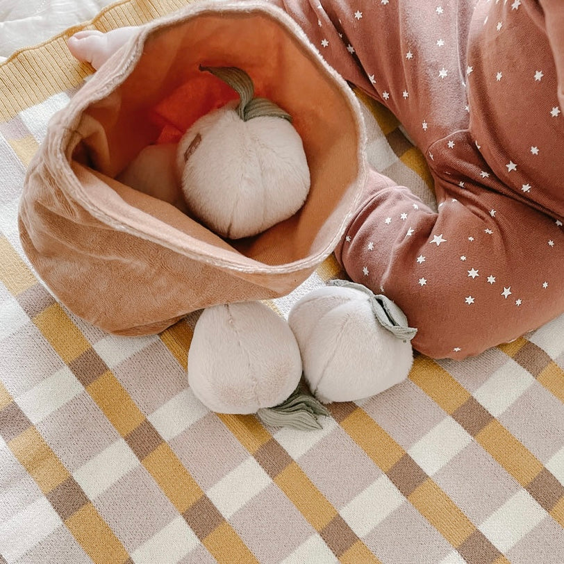 Anyone could easily fall in love with this darling peach counting play set. Each peach is made with a soft low pile faux fur with bell balls inside, and has a different count of leaves from 1 to 5 so you can use them as a teaching tool for counting in the future. By guiding your child to notice the difference between the peaches, they can also practice visual and mental focus.