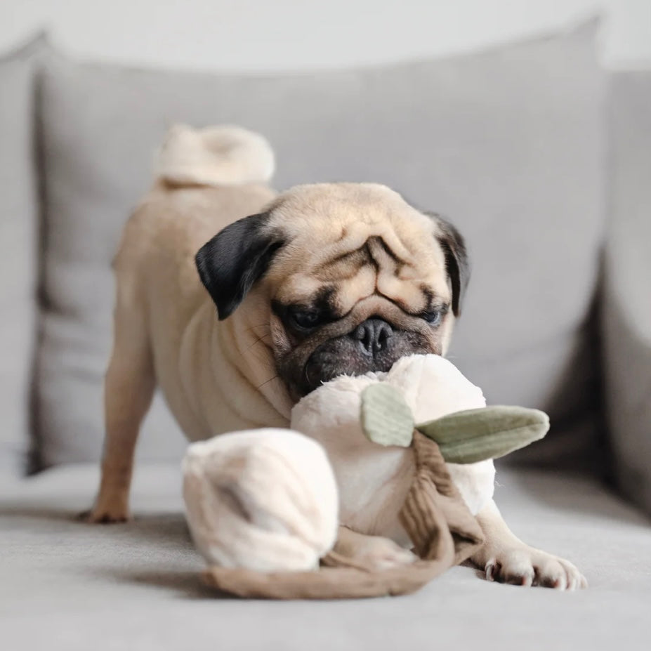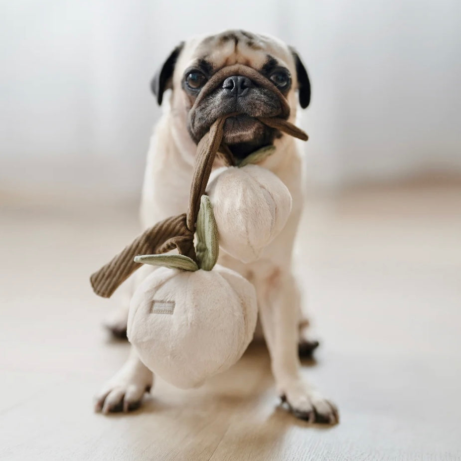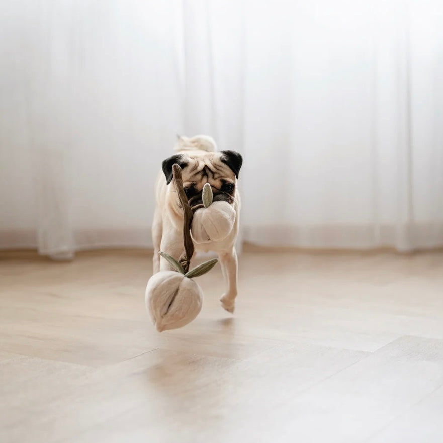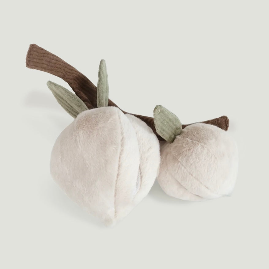 Our snuffle MOMO peaches features 1 large + 1 small treat pockets in two peaches that open sideways as the snoot make its way in! The branch crinkles and connects the two peaches loosely for those who loves to shake while playing. Squeakers are added inside for extra fun.