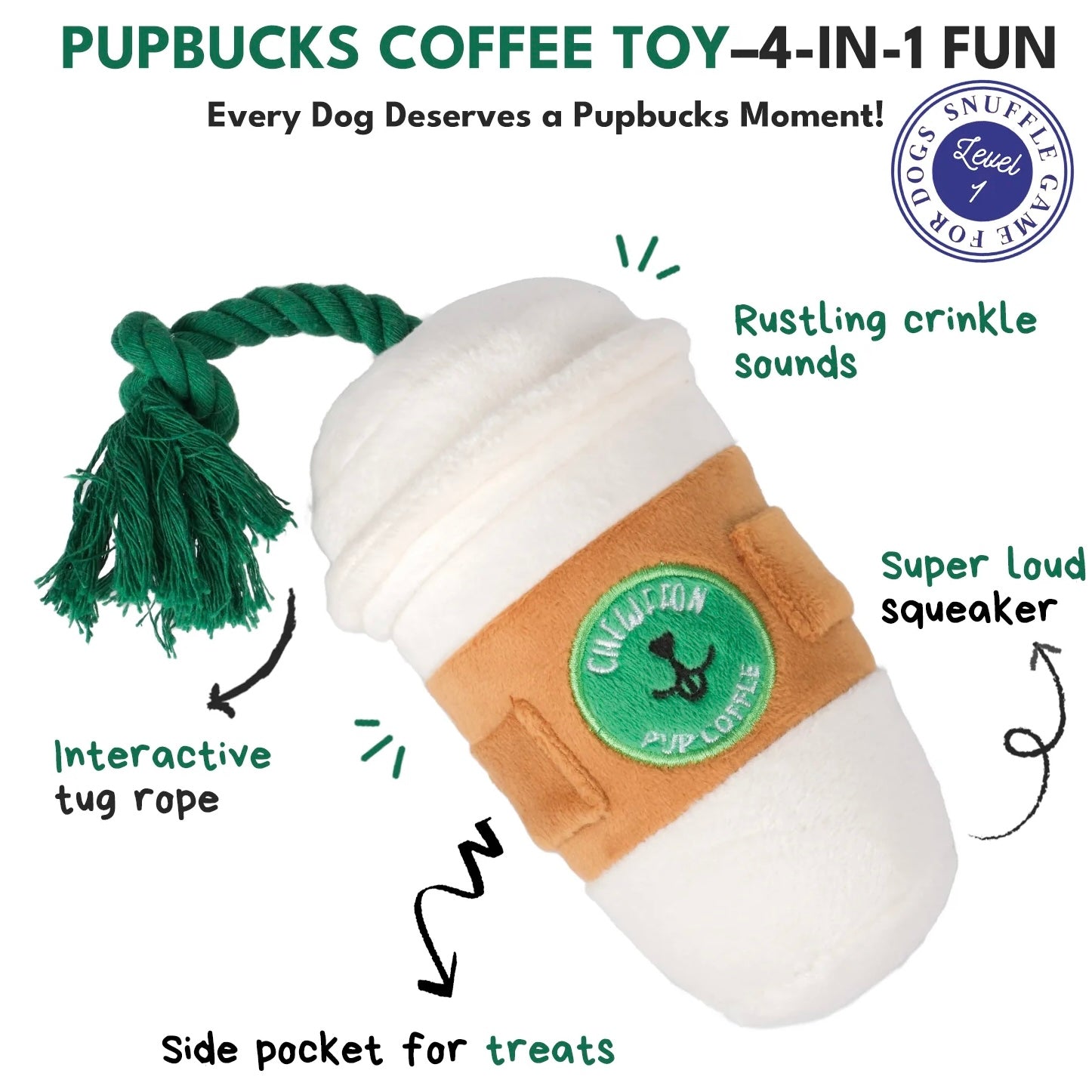 Bring café-inspired fun to your dog’s playtime with this adorable coffee cup plush toy from CHEWFFON. Designed as part of the Snuffle Level 1 Collection, this interactive dog toy combines playful design with engaging enrichment features dogs love.