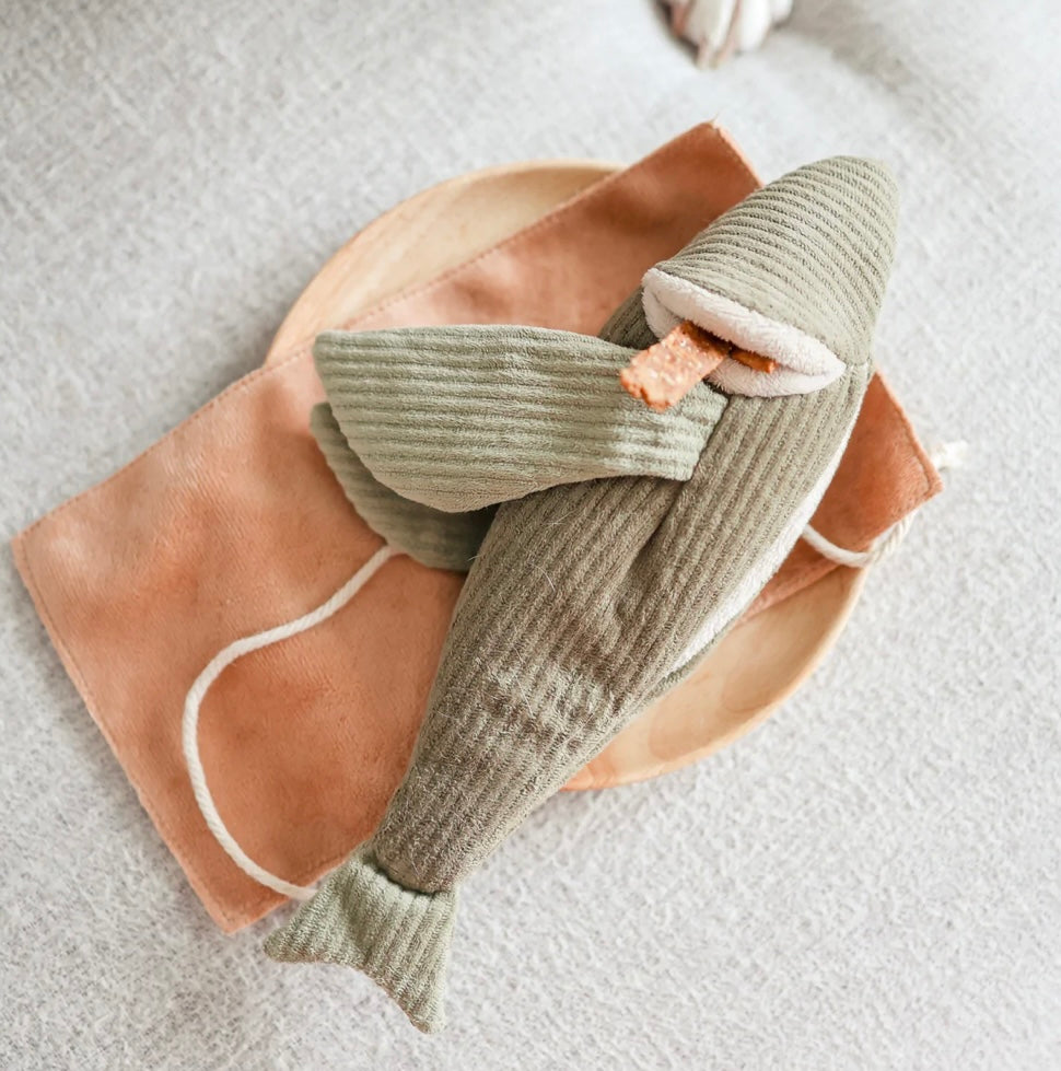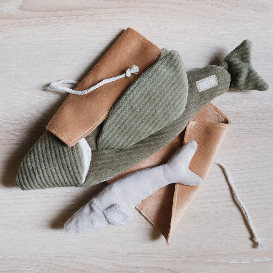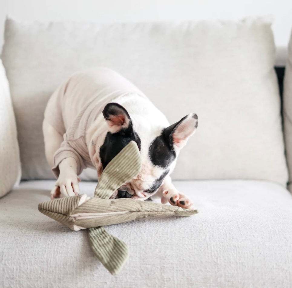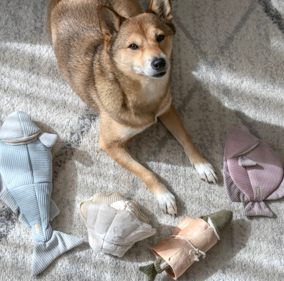 FLYING FISH is a 2-in-1 burrow and snuffle enrichment play object. Outside is a wrap to be untied or another layer to hide longer treats; inside is a squeaky baby fish and the two large fins crinkles! There are multiple pockets for you to hide treats in.