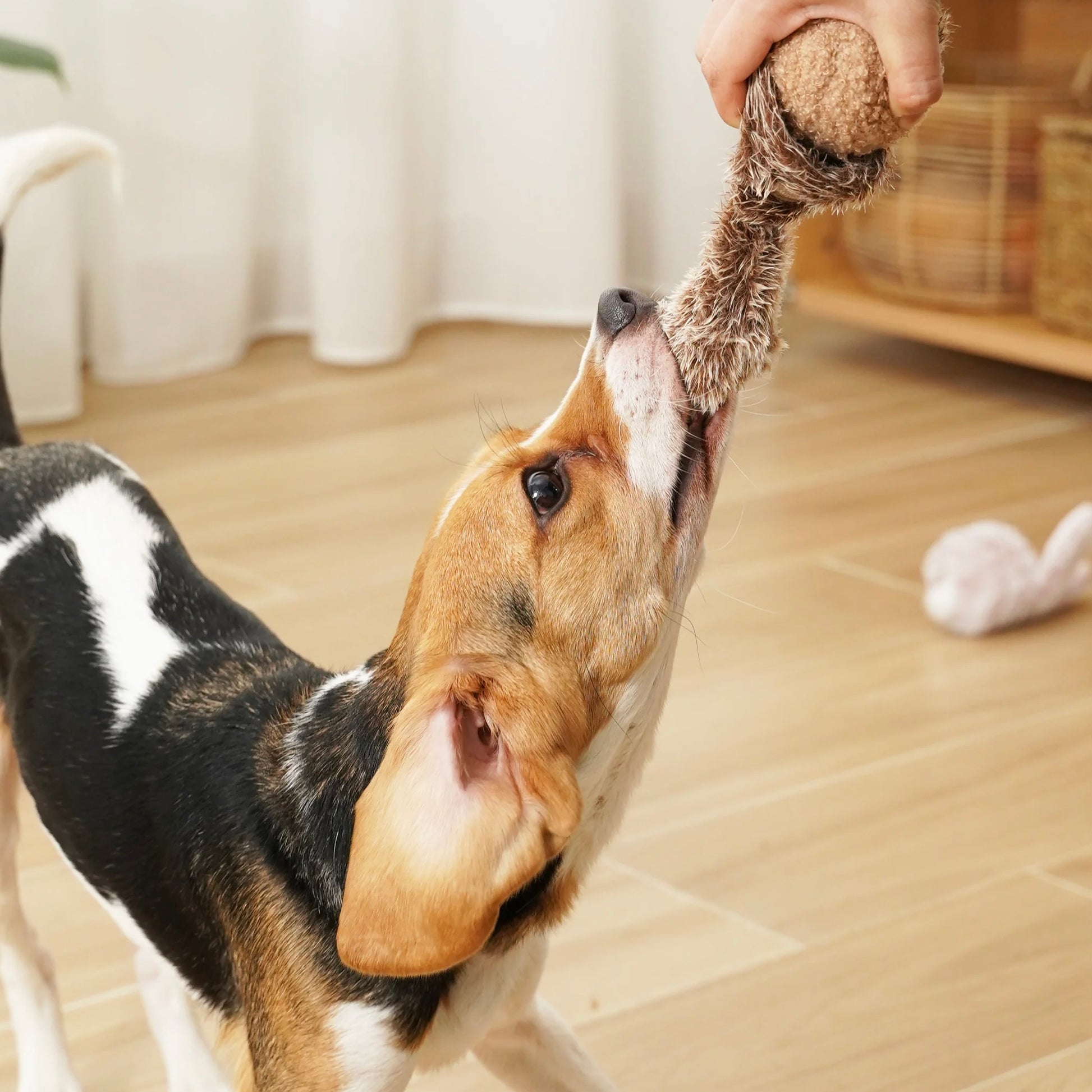 The squirrel tail is filled with crinkling paper and a squeaker.