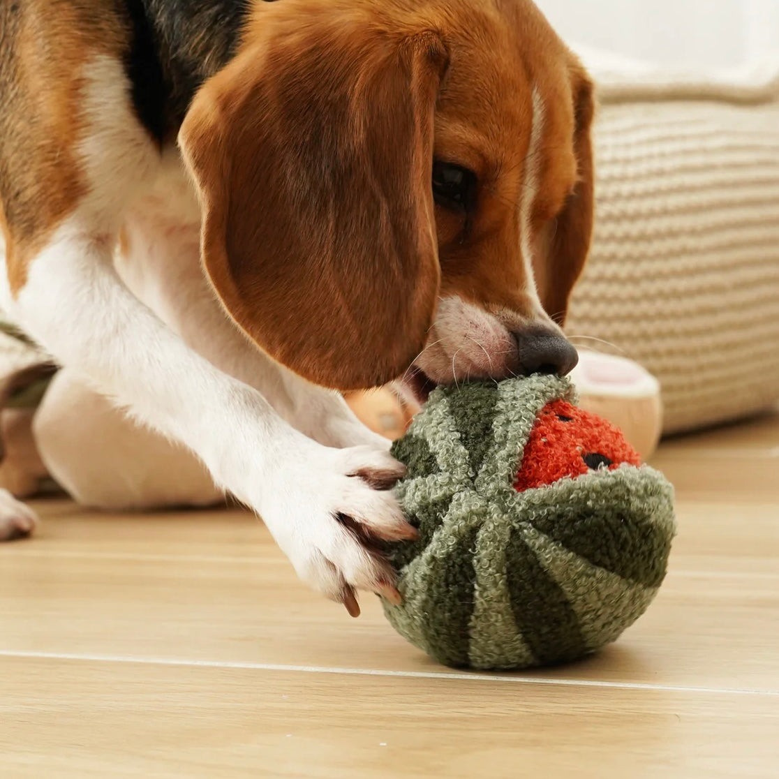 The WATERMELON POP combines all the fun of popcorn, balls and furry plush play object into one! The teddy wrapped TPR squeaky ball is not only durable but also soft on the canine mouth, the watermelon skin can be taken off and washed regularly. This POP is perfect for pups who love large balls!